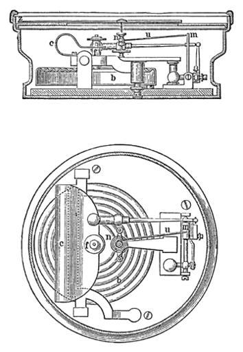 Keywords: Meyers b2 s0386 b1.png de Naudets Federbarometer oben Durchschnitt unten Grundriss b metallene Büchse c f m n u Räder- und Hebelwerk z Zeiger Meyers b2 s0386 jpg ca 1885 author PD-Meyers Barometers Images from Meyers Konversationslexikon 4th edition - text figures