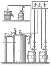 | Keywords: Meyers b2 s0923 b1.png de Bierdruckapparat mit flüssiger Kohlensäure a “ schmiedeeiserne Druckflasche mit Kohlensäure b “ Windkessel c “ Handgriff d e g l o “ Hähne f “ Sicherheitsventil h “ Ventil i “ Rohr k p “ Manometer m “ gläsernes Gefäß n q r s “ Zapfhähne I II III IV “ verschiedene Arten des Ausschanks aus Fässern Meyers b2 s0923 jpg ca 1885 author PD-Meyers Beer barrels Images from Meyers Konversationslexikon 4th edition - text figures | ||||