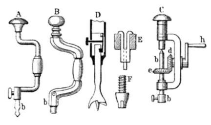 | Keywords: Meyers b3 s0151 b2.png de Brustleier oder Bohrwinde A B und Eckenbohrer C A Befestigung durch Druckschraube D Verschluss mit Knopf E Holzfeder mit Nasen F Schraube b Bohrer d e ZahnrΓ€der h Handkurbel Meyers b3 s0151 jpg ca 1885 author PD-Meyers Hand-powered drills Images from Meyers Konversationslexikon 4th edition - text figures |