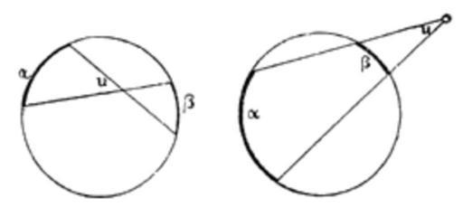 | Keywords: Meyers b5 s0983 b2.png de Exzentrische Winkel Aus dem Text des zugehörigen Artikels Exzentrische Winkel sind ¦ solche Winkel welche von zwei sich nicht im Mittelpunkt eines Kreises schneidenden Sehnen gebildet werden Je nachdem sich die Sehnen innerhalb Fig 1 oder in ihren Verlängerungen auĂźerhalb des Kreises schneiden Fig 2 wird der exzentrische Winkel u entweder von der halben Summe oder von dem halben Unterschied der beiden Kreisbogen a und b welche zwischen seinen Schenkeln und deren Verlängerungen liegen gemessen Meyers b5 s0983 jpg ca 1885 author PD-Meyers Images from Meyers Konversationslexikon 4th edition - text figures Angles geometry |