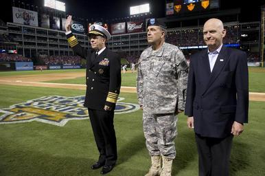 | Keywords: Michael Mullen & Peter Chiarelli at 2010 World Series Game 4 2.jpg Chairman of the Joint Chiefs of Staff Adm Mike Mullen Army Vice Chief of Staff Gen Peter W Chiarelli and Deputy Undersecretary of Defense for Wounded Warrior Care and Transition Policy John Campbell are recognized for their dedication to service members and their families during Game 4 of the 106th World Series between the San Francisco Giants and Texas Rangers in Arlington Texas on Oct 31 2010 Major League Baseball dedicated the game to the Welcome Back Veterans initiative that honors and encourages support of returning military members and their families 2010-10-31 http //www defense gov/photos/newsphoto aspx newsphotoid 13342 PO1 Chad J McNeeley PD-USGov-Military-Navy Files by User BrokenSphere 2010 World Series Peter W Chiarelli Michael G Mullen in 2010 20101031 |