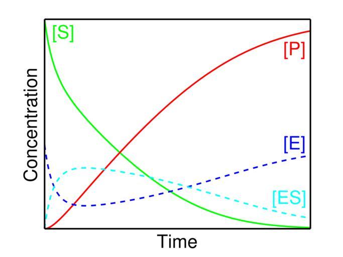 MAKE A MEME View Large Image Michaelis Menten S P E ES.svg Michaelis “Menten kinetics parameter values used were k<sub>f</sub> 0 001 k<sub>r</sub> 0 0001 k<sub>cat</sub> 0 1 S<sub>0</sub> 500 E<sub>0</sub> 200 P<sub>0</sub> ES<sub>0</sub> 0 evaluated to t 50 as in http ...