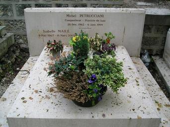 Keywords: michel falls petrucciani pianniste jazz composer and isabelle maile his wife pere lachaise cemetery paris france michel antoine petrucciani french birth-death 1962-1999 death 36 years tomb stone marble flowers washbasin tomb in memoriam