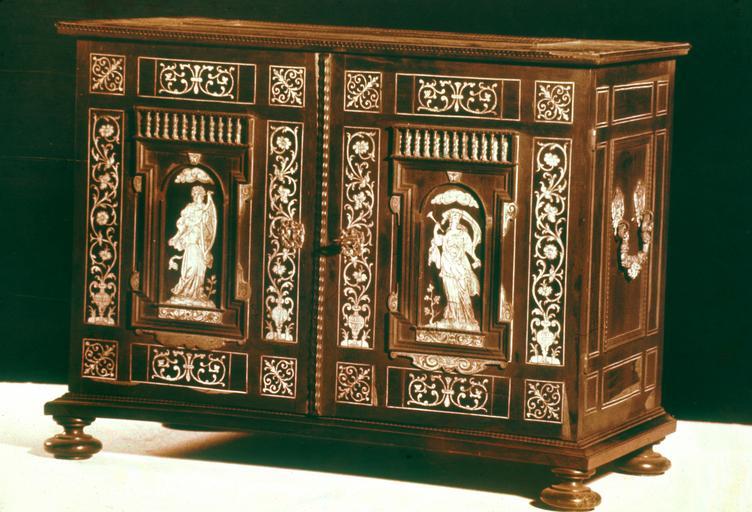 Keywords: Michiel Verbist - Cabinet with Allegorical Figure of Music - Walters 6523.jpg This cabinet with its combination of dark woods inset with bone plaques represents the high caliber of Antwerp cabinetry Michiel Verbist who monogrammed it on the underside had aristocratic clients in England as well as in the Netherlands The engraved plaques on the exterior represent personifications of music while the drawers are decorated with scenes of rural peasant life such as hunting rabbits On the open book held by the woman with the horn is inscribed what may be the name of the engraver IAN / H ca 1625 Baroque wood rosewood mahogany and fir bone cm 49 5 67 5 accession number 65 23 38136 Henry Walters Baltimore date and mode of acquisition unknown Walters Art Museum Henry Walters Acquired by Henry Walters Signature On book IAN / H Highlights from the Collection The Walters Art Gallery Baltimore 1998-2001 place of origin Antwerp Belgium Walters Art Museum license Baroque art in the Walters Art Museum Furniture in the Walters Art Museum Michiel Verbist Allegories of music |
