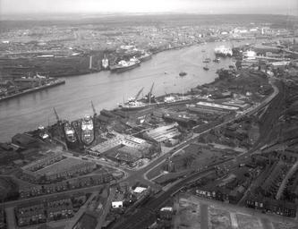 | Keywords: aerial photograph aerialphotograph south tyneside southtyneside south shields southshields industry river tyne rivertyne engineering ship repair shiprepair middle docks & engineering company ltd middledocksengineeringcompanyltd dry docks drydocks black and white photograph blackandwhitephotograph july, 1962 july1962 ship repairers shiprepairers turners ltd turnersltd industrial heritage industrialheritage cranes river water bank buildings windows walls roof glass chimney bricks road debris pole vehicles vessels deck cabin cargo vegetation platform plate structure frame grass soil striking blackandwhite monochrome shore outdoor coast landscape skyline seaside black and white Aerial view of the premises of the Middle Docks and Engineering Company Ltd, South Shields, July 1962 (TWAM ref. DT.TUR/2/29539C). The firm were engineers and ship repairers. Tyne & Wear Archives is proud to present a series of aerial photographs of South Tyneside. These images were captured by the Newcastle-based photographic firm Turners Ltd. Many of the images reflect the district's rich industrial heritage, showing businesses and places that no longer exist. We would be delighted if you could help us to tag these by adding the names of streets and buildings that you recognise. Old photographs can often stimulate distant memories and we would also love to hear any reminiscences that these images inspire (Copyright) We're happy for you to share these digital images within the spirit of The Commons. Please cite 'Tyne & Wear Archives & Museums' when reusing. Certain restrictions on high quality reproductions and commercial use of the original physical version apply though; if you're unsure please email archives@twmuseums.org.uk Aerial view of the premises of the Middle Docks and Engineering Company Ltd, South Shields, July 1962 (TWAM ref. DT.TUR/2/29539C). The firm were engineers and ship repairers. Tyne & Wear Archives is proud to present a series of aerial photographs of South Tyneside. These images were captured by the Newcastle-based photographic firm Turners Ltd. Many of the images reflect the district's rich industrial heritage, showing businesses and places that no longer exist. We would be delighted if you could help us to tag these by adding the names of streets and buildings that you recognise. Old photographs can often stimulate distant memories and we would also love to hear any reminiscences that these images inspire (Copyright) We're happy for you to share these digital images within the spirit of The Commons. Please cite 'Tyne & Wear Archives & Museums' when reusing. Certain restrictions on high quality reproductions and commercial use of the original physical version apply though; if you're unsure please email archives@twmuseums.org.uk |