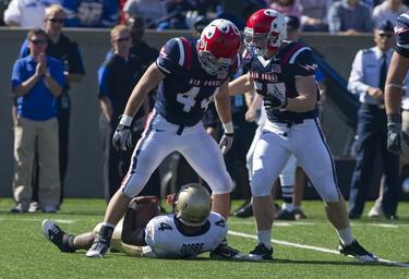 | Keywords: Midshipmen on offense at Navy at Air Force 2010-10-02 3.JPG U S Air Force Academy Falcon Linebackers Patrick Hennessey and Austin Niklas celebrate after sacking U S Naval Academy Midshipmen Quarterback Ricky Dobbs Oct 2 2010 The Falcons ended a seven year drought defeating the Midshipmen 14-6 http //www defense gov/PhotoEssays/PhotoEssaySS aspx ID 1890 2010-10-02 P01 Chad J McNeeley PD-USGov-Military-Navy Files by User BrokenSphere 2010 Air Force Falcons football team 2010 Navy Midshipmen football team Ricky Dobbs in 2010 Sack American football |