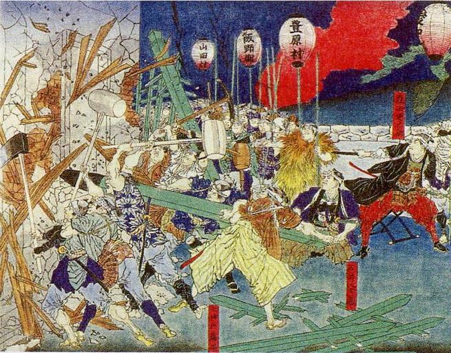 | Keywords: Mie kenka Shomin bodo no Jiken.jpg  en This is a scene of Riot of Ise or Ise Bodo in 1876 This picture was painted by Yoshitoshi Tsukioka ja 1876年(明治9年)に発生した伊勢暴動の様子  岡芳年筆  佐  寬司・ 立道久 高等学校 日 史A 改訂版 清水書院 平成20年2 15日再販発行 平成18年3 20日文部科学  定済 高等学校 理歴史科 35 清水 日A 09 ISBN 978-4-389-60010-5  59ページに掲載  en Early era of Meiji about 1876 - 1890 ja 明治   en Yoshitoshi Tsukioka ja  岡芳年 Other fields Information field ucfirst location/i18n en The vicinity of Kumozu Ichishi Mie Japan Now it is in Tsu city ja 三重  志郡雲出付近(現・津市)  Ono Japanese axe Otsuchi war mallet Tsukioka Yoshitoshi 1876 Tsu Mie Riots in Japan PD-Japan |