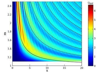 | Keywords: Mie scattering - scattering efficiency as a function of refractive index and size parameter.png en This false color image represents the scattering efficiency <math>Q_\text diff </math> as a function of size parameter x and the ratio m between the refractive index of the sphere assumed to be real and that of the surrounding medium <math>Q_\text diff </math> is defined as <math>Q_\text diff \sigma_\text diff / \pi a 2 </math> where a is the radius of the sphere and <math>\sigma_\text diff </math> is the scattering cross section The size parameter x is defined as <math>x 2\pi \ N \ a / \lambda</math> where N is the refractive index of the surrounding medium and λ is the wavelength in vacuum The black lines are defined by <math>2x m-1 2p+1 \pi</math> corresponding to destructive interferences between the ray passing through the center of the sphere and a ray passing outside the sphere These results have been obtained by using the MiePlot program and compiled with Octave fr Cette image en fausses couleurs représente l'efficacité de diffusion <math>Q_\text diff </math> en fonction du paramètre de taille x et du rapport m entre l'indice de réfraction de la sphère supposé réel et celui du milieu environnant <math>Q_\text diff </math> est défini par <math>Q_\text diff \sigma_\text diff / \pi a 2 </math> où a est le rayon de la sphère et <math>\sigma_\text diff </math> est la section efficace de diffusion Le paramètre de taille est défini par <math>x 2\pi \ N \ a / \lambda</math> où N est l'indice de réfraction du milieu entourant la sphère et λ est la longueur d'onde dans le vide Les lignes noires sont définies par l'équation <math>2x m-1 2p+1 \pi</math> correspondant à des interférences destructives entre le rayon passant par le centre de la sphère et un rayon passant à côté de la sphère Ces résultats ont été obtenus en utilisant le programme MiePlot avec un post traitement sous Octave 2015-07-24 own Mathieu Perrin other versions cc-zero Uploaded with UploadWizard Light scattering |