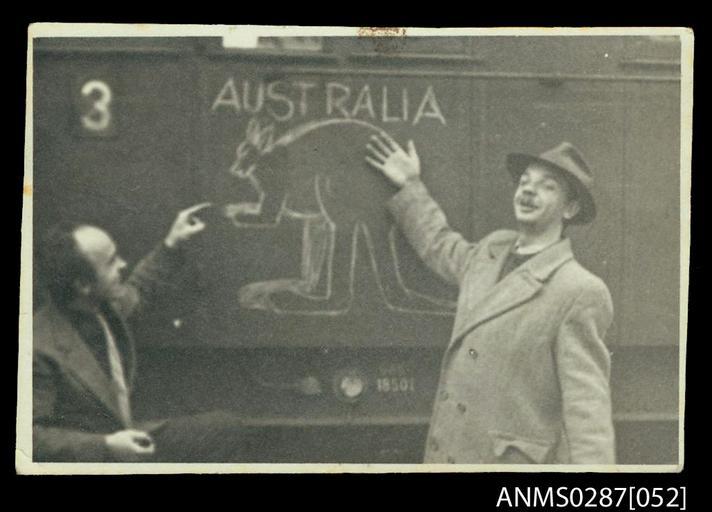 Keywords: alex nypl alexnypl czechoslovakian migrant czechoslovakianmigrant czechoslovakia ludwigsberg train migrant migrants post-war migration postwarmigration immigration australia kangaroo photo border Black and white photographic print showing a kangaroo painted on the side of a carriage, with two men (on either side) pointing to it. `Australia' is written in block letters above the picture. An inscription on the reverse reads: `painted picture of / kangaroo on our / train in Ludwigsburg / November 1948 / Alex Nypl / (Newman)'. Alex Nypl was a Czechoslovakian migrant who arrived in Melbourne on PROTEA, 23 December 1948. The ANMM undertakes research and accepts public comments that enhance the information we hold about images in our collection. Object no. ANMS0287[052] ANMM Collection Gift from Alex Newman The Australian National Maritime Museum will be holding an after-dark lightshow based on stories of migration from 26 January to 17 February 2013. Check the website for more information on 'Waves of Migration', and how you can tell share your migration story. Black and white photographic print showing a kangaroo painted on the side of a carriage, with two men (on either side) pointing to it. `Australia' is written in block letters above the picture. An inscription on the reverse reads: `painted picture of / kangaroo on our / train in Ludwigsburg / November 1948 / Alex Nypl / (Newman)'. Alex Nypl was a Czechoslovakian migrant who arrived in Melbourne on PROTEA, 23 December 1948. The ANMM undertakes research and accepts public comments that enhance the information we hold about images in our collection. Object no. ANMS0287[052] ANMM Collection Gift from Alex Newman The Australian National Maritime Museum will be holding an after-dark lightshow based on stories of migration from 26 January to 17 February 2013. Check the website for more information on 'Waves of Migration', and how you can tell share your migration story. |