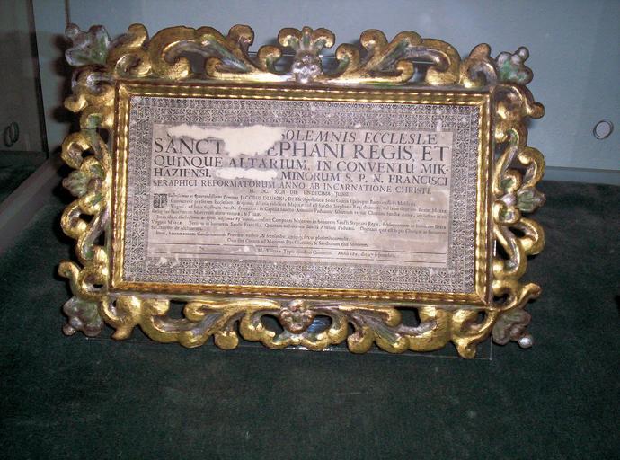 | Keywords: Mikházi templom 1692.jpg A mikházi Szent István király tiszteletére emelt ferences templom 1692 évi felszentelése alkalmából készÃtett nyomtatvány A fémszinezett fakeret feltehetÅ‘en a nyomtatvánnyal azonos idÅ‘ben készült A templomot Jakub Franciszek Dluszki lengyel konventuális ferences és bákói püspök szentelte fel 1692 június 11-én CsÃki Székely Múzeum CsÃkszereda “ photo taken by uploader User Csanády in 2006 History of Transylvania Miercurea Ciuc 2007-03-15 own assumed Csanády |