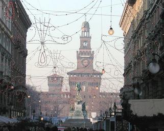 Keywords: Milano castello sforzesco natale.jpg Milano Italy Castello Sforzesco December 2005 2000-01-01 own assumed Paolo da Reggio~commonswiki Filarete Tower - Remote views Via Dante Milan