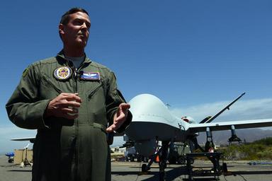 | Keywords: Military addresses UAS threat in Black Dart 2015 demonstration 150731-D-BN624-002.jpg en Air Force Maj Scott Gregg Black Dart project officer speaks to the media in front of an MQ-9 Reaper unmanned aircraft system at Naval Base Ventura County and Sea Range Point Mugu Calif July 31 2015 The drone said Gregg is in the largest categories of UASs or Group 5 flies at more than 18 000 feet and weighs more than 1 300 pounds It was being used as part of the two-week Black Dart counter-UAS demonstration July 26 to Aug 1 to assess and improve technologies tactics and techniques used by DoD and its partners DoD News photo by Lisa Ferdinando 2015-07-31 Lisa Ferdinando https //www dvidshub net/image/2099511 150731-D-BN624-002 2015-08-01 12 10 POINT MUGU NAWC CA US 3 PD-USGov Naval Base Ventura County Images from DoD uploaded by Fæ |