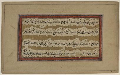 | Keywords: Military Document WDL6842.png Artwork ru Али ухибб fr 'Ali Muhibb en 'Ali Muhibb zh 穆赫比·阿里 pt 'Ali Muhibb ar على، مُحب es 'Ali Muhibb ru Военный документ fr Document militaire en Military Document zh 军事文件 pt Documento militar ar وثيقة عسكرية ru Этот <em>sanad</em> документ составлен в фо ме <em>namah</em> письма выполненного письмом насталик че ного цвета в об амлении полос из облаков на золотом фоне Письмо ад есовано п авителем некоему и зе Ядыга у к кото ому авто об ащается за военной помощью В ответ и за Ядыга посылает известного бойца и зу Килича <em>qilich</em> значит меч на ту ецком языке Благода я своему боевому масте ству и за Килич известный как Рустам-и-Заман Рустам своего в емени так как Рустам был великим пе сидским ге оем оказывает военную помощь побеждая неп иятелей п авителя В последней ст оке текста гово ится о том что <em> tahrir namud </em> документ был написан ухиббом Али 12-го дня 1-го месяца джумада в 1220 г хидж ы 8 августа 1805 г Тю кское имя ге оя и за Килич указывает на то что документ может относиться к стычкам на г анице между Оттоманской Ту цией и Пе сией в пе вом десятилетии XIX в либо к конфликтам в Афганистане или Цент альной Азии в тот же пе иод <br>Каллиг афия пе сидская; Пе еписка; Иллюмини ование укописей; Письма; Письмо насталик; Солдаты fr Ce <em>sanad</em> document écrit en caractères nasta'liq noirs dans des rubans de nuage sur un fond doré est réalisé sous la forme d'une <em>namah</em> lettre l'origine de cette lettre un souverain demande une assistance militaire à un certain Mirza Yadigar En réponse ce dernier envoie auprès du souverain un combattant réputé du nom de Mirza Qilich <em>qilich</em> signifie « sabre » en turc Mirza Qilich également appelé Rustam-i Zaman le Rostam de son temps Rostam étant un grand héros persan grâce à ses prouesses au combat fournit l'aide requise pour vaincre les adversaires du souverain La dernière ligne du texte indique « <em>tahrir namud</em> » le document fut écrit par Muhibb 'Ali le 12 du premier mois de joumada en l'an 1220 après l'Hégire 8 août 1805 Le nom turc du héros Mirza Qilich laisse entendre que ce document faisait référence aux affrontements à la frontière perso-turque ottomane durant la première décennie du XIX<sup>e</sup> siècle ou aux conflits en Afghanistan ou Asie centrale à la même période <br>Calligraphie persane; Correspondance; Enluminures; Lettres; Écriture nastaliq; Soldats en This <em>sanad</em> document is in the form of a <em>namah</em> letter written in black Nasta'liq script and outlined in cloud bands on a gold background The letter is from a ruler to a certain Mirza Yadigar from whom he requests military assistance In response the ruler sends a reputable fighter named Mirza Qilich <em>qilich</em> means sword in Turkish to the ruler Known as Rustam-i Zaman the Rustam of his day Rustam being a great Persian hero because of his fighting prowess Mirza Qilich provides military assistance to vanquish the ruler's adversaries The last line of text states <em>tahrir namud</em> the document was written by Muhibb 'Ali on 12 Jumada I 1220 AH August 8 1805 The Turkic name of the hero Mirza Qilich hints that the document may have been related to clashes on the Ottoman Turkish Persian border during the first decade of the 19th century or perhaps to conflicts in Afghanistan or Central Asia in the same period <br>Calligraphy Persian; Correspondence; Illuminations; Letters; Nasta'liq script; Soldiers zh 这份文件采用书信格式,以黑色波斯体书写,字体周围是带状云彩图案,背景为金色 这是 位统治 写给某个名叫米尔扎·亚迪加 Mirza Yadigar 的人的 封信,向他请求军事援助 收到信后,米尔扎·亚迪加向这个统治 派出了名叫米尔扎·奇利兹(Mirza Qilich,<em>qilich</em> 其语中意为 剑 )的著名武士 米尔扎·奇利兹以英勇善战 闻名,被称为鲁斯塔姆-i·扎曼(意 是当代的鲁斯塔姆,鲁斯塔姆是 位伟大的波斯英雄),米尔扎·奇利兹向这位统治 提供军事援助,以帮助其征 敌人 正文的 后 行注明 文件书写 是穆赫比·阿里 Muhibb 'Ali ,写 日 是伊斯兰历 1220 年 5 12 日(公元 1805 年 8 8 日) 这位战争英雄的名字米尔扎·奇利兹是突厥语,说明该文件可能与 19 世纪 始的十年中奥斯曼 其与波斯的边界冲突 关,或 与同时 阿富汗或中亚 区的冲突 关 <br>书法,波斯语; 信; 插图; 信函; 波斯体书法; 士兵 pt Este <em>sanad</em> documento está na forma de uma <em>namah</em> carta redigida na cor preta na escrita Nasta'liq e delineada em faixas de nuvens sobre um plano de fundo dourado A carta é remetida por um governante para um determinado Mirza Yadigar a quem ele solicita ajuda militar Em resposta Mirza Yadigar envia um renomado guerreiro chamado Mirza Qilich <em>qilich</em> significa espada em turco para o governante Conhecido como Rustam-i Zaman o Rostam de sua época Rostam era um grande herói persa devido à sua destreza para a luta Mirza Qilich oferece ajuda militar para vencer os adversários do governante A última linha do texto declara que <em>tah