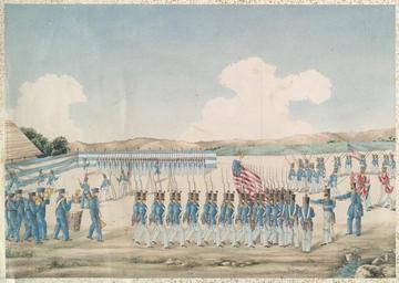 | Keywords: Military Exercises WDL2958.png Artwork ru Военные учения fr Exercices militaires en Military Exercises zh 军事练习 pt Exercícios Militares ar التدريبات العسكرية ru Летом 1853 года Коммодо этью С Пе и п едставитель военного-мо ского флота США п ибыл с визитом в Японию доставив послание от п езидента США илла да Филлмо а с т ебованием яда уступок выдвинутым японскими властями В 1854 году после визита Пе и был заключен Догово Канагава по кото ому японские по ты отк ывались для то говли с Соединенными Штатами а этой ка тине неизвестного японского художника изоб ажено посещение боевых учений п оводимых войсками США Это четве тая панель из 12-панельного свитка с шелковым пе еплетом из коллекции Библиотеки Б ауновского Униве ситета Свиток похож на д угие свитки этого пе иода в частности на свиток Че ного ко абля п инадлежащий Академии художеств в Гонолулу Художник использует сине-белые знамена в качестве ог аждения вок уг аме иканских солдат Возможно что авто ешил использовать синий цвет вместо че ного потому что че ный и белый цвета являлись цветами сёгуната Токугава Ве оятно изоб аженный слева дом место где был подписан догово Канагава Изоб ажение относится к Военной коллекции Анны С К Б аун х анящейся в Библиотеке Б ауновского униве ситета самой выдающейся аме иканской коллекции посвященной исто ии и иконог афии военнослужащих и воинской службы и одной из к упнейших ми овых коллекций посвященных изучению военных и военно-мо ских мунди ов <br> еждуна одные отношения; Пе и этью Колб айт 1794-1858 гг ; Военно-мо ская экспедиция США в Японию 1852-1854 гг fr Au cours l'été 1853 le Commodore Matthew C Perry de la U S Navy se rendit au Japon porteur d'une lettre du Président des États-Unis Millard Fillmore demandant certaines concessions à la cour japonaise La visite de Perry fut suivie par la conclusion du Traité de Kanagawa en 1854 qui ouvrit les ports japonais au commerce nord-américain Cette peinture d'un artiste japonais anonyme montre des troupes américaines en visite conduisant des exercices militaires Il s'agit du quatrième panneau d'un rouleau de 12 panneaux relié en soie provenant des collections de la Bibliothèque de l'Université Brown University il est similaire à d'autres rouleaux de la période tel que le Black Ship Scroll détenu par l'Académie des Beaux-Arts d'Honolulu L'artiste utilise des bannières bleues et blanches pour distinguer les soldats américains Il a pu avoir choisi d'utiliser du bleu au lieu du noir parce que le noir et le blanc étaient les couleurs impériales du shogunat Tokugawa La bâtisse sur la gauche a pu être la Maison du Traité où fut signée le traité de Kangawa La peinture provient de la collection militaire Anne S K Brown à la Bibliothèque de l'Université Brown la plus importante collection américaine consacrée à l'histoire et à l'iconographie des soldats et à la vie militaire et l'une des plus vastes collections au monde dédiée à l'étude des uniformes militaires et marins <br>Relations internationales; Perry Matthew Calbraith 1794-1858; Expédition Navale des États-Unis au Japon 1852-1854 en In the summer of 1853 Commodore Matthew C Perry of the U S Navy visited Japan bearing a letter from U S President Millard Fillmore demanding certain concessions from the Japanese court Perry s visit was followed by the conclusion of the 1854 Treaty of Kanagawa which opened Japanese ports to U S trade This painting by an anonymous Japanese artist shows visiting U S troops conducting military exercises It is the fourth panel of a 12-panel silk-bound scroll from the collections of the Brown University Library and is similar to other scrolls from the period such as the Black Ship Scroll owned by the Honolulu Academy of Arts The artist uses blue-and-white banners to fence in the American soldiers The artist may have chosen to use blue instead of black because black and white were the imperial colors of the Tokugawa shogunate The house on the left may have been the Treaty House where the Treaty of Kangawa was signed The painting is from the Anne S K Brown Military Collection at the Brown University Library the foremost American collection devoted to the history and iconography of soldiers and soldiering and one of the world s largest collections devoted to the study of military and naval uniforms <br>International relations; Perry Matthew Calbraith 1794-1858; United States Naval Expedition to Japan 1852-1854 zh 1853 年夏,美国海军准将马修·C· 佩里 访问日 ,同时带了 封 美国 统米勒德·菲尔莫尔要求日 做出让步的信函 佩里访问后,日 和美国签署了 1854 年 神奈 约 ,该 约为美日贸易 放了日 港口 这幅由 知日 画家创 的画 描绘的是到访日 的美国士兵正 进行军事演习 这幅图画是 12 幅线装画卷中的第 