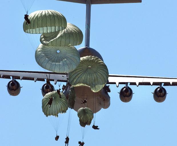Keywords: military paratroopers airborne parachuting warriors soldiers army uniform airplane jump