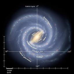 | Keywords: Milky Way 2008 annotated sv.jpg en Artist's conception of the spiral structure of the Milky Way with two major stellar arms and a central bar This is an annotated version in Swedish derived from File Milky Way 2005 jpg 2008 updates included which originates from NASA The text includes the names of major galactic arms the Sun's position and approximate distances and galactic logitutes sv En konstnärs vy av Vintergatan ursprungligen från NASA med inlagd svensk text som beskriver galaxens armar solen position en skala med ungefärliga avstånd samt galaktiska longituder 2012-01-06 own Kjell André This file is a derivative ofm File Milky Way 2005 jpg cc-zero Uploaded with UploadWizard Milky Way maps Galactic coordinate system |