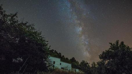 Keywords: milky way farmhouse sky star landscape trail house olive trees building field trees casa vieja old building facade wall abandoned cantarrijan nerja malaga spain mount starry night