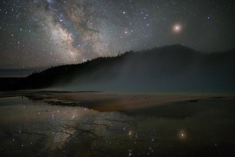 Keywords: milky way stars sky grand prismatic spring hot water reflection night dark cosmos thermal nature volcanic colorful outdoors geothermal minerals boiling pool mist yellowstone national park wyoming usa steam trees silhouettes