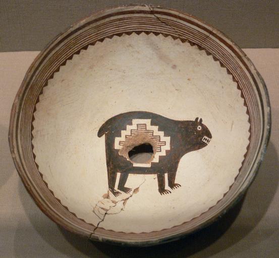 | Keywords: Mimbres Bowl with bear DMA 1990-216-FA.jpg Bowl with bear ceramic Mimbres black-on-white type ; Mimbres people Mogollon culture New Mexico USA c AD 1000 “1150 <br />Dallas Museum of Art Dallas Texas; Foundation of the Arts Collection anonymous gift; object number 1990 216 FA own 2009-10 Photo User FA2010 Collections of the Dallas Museum of Art Mimbres pottery Bears in art | ||||