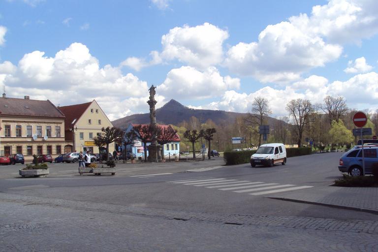 Keywords: Mimoň 007.JPG cs Náměstí 1 máje se sloupem Pany Marie v pozadí kopec Ralsko own Zákupák 2012-04-23 50 39 32 480 N 14 43 30 902 E region CZ Náměstí 1 máje Mimoň Ralsko Hill
