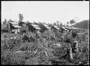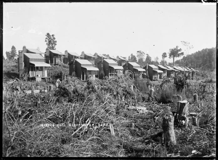 | Keywords: blackandwhite monochrome photo border outdoor black and white Scene at Waiuta, Inangahua County, which was centred on the Blackwater gold mine. Shows two rows of miners' huts, probably prefabricated. Each of them has a front door, one window, a small verandah in front, and a chimney. Photograph taken by William Archer Price circa 1910. Inscriptions: Inscribed - Photographer's title on negative -bottom left: Miners' huts. Blackwater. No. 408.E. The 'Red Huts' were built circa 1908 by Blackwater Mines Ltd for single workers, and were sold as farm huts etc when the mine, and town, closed in 1951. Quantity: 1 b&w original negative(s). Physical Description: Dry plate glass negative Miners' huts at Waiuta, West Coast. Price, William Archer, 1866-1948 :Collection of post card negatives. Ref: 1/2-001741-G. Alexander Turnbull Library, Wellington, New Zealand. natlib.govt.nz/records/22707153 Scene at Waiuta, Inangahua County, which was centred on the Blackwater gold mine. Shows two rows of miners' huts, probably prefabricated. Each of them has a front door, one window, a small verandah in front, and a chimney. Photograph taken by William Archer Price circa 1910. Inscriptions: Inscribed - Photographer's title on negative -bottom left: Miners' huts. Blackwater. No. 408.E. The 'Red Huts' were built circa 1908 by Blackwater Mines Ltd for single workers, and were sold as farm huts etc when the mine, and town, closed in 1951. Quantity: 1 b&w original negative(s). Physical Description: Dry plate glass negative Miners' huts at Waiuta, West Coast. Price, William Archer, 1866-1948 :Collection of post card negatives. Ref: 1/2-001741-G. Alexander Turnbull Library, Wellington, New Zealand. natlib.govt.nz/records/22707153 |