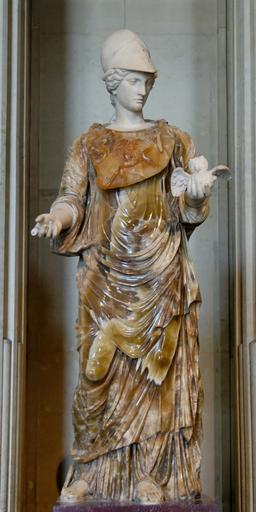 Keywords: Minerva onyx Louvre Ma2225.jpg Helmeted Minerva holding a tiny owl Marble and golden onyxmarble 2nd century AD and 18th century restorations The onyx body is a Roman copy of the Hera Borghese type; the statue was restored as Minerva by adding marble head and arms Minerve casquée tenant une petite chouette Marbre et onyx doré IIe siècle ap J -C et restaurations du XVIIIe siècle Le corps en onyx est une copie du type de l'Héra Borghèse ; la statue a été restaurée en Minerve par l'ajout d'une tête et de bras en marbre marble onyx cm 133 Museum Louvre Department of Greek Etruscan and Roman antiquities Denon ground floor room B object history credit line Collections of the comte d'Orsay; seized during the French Revolution 1793 accession number Ma 2225 MR 292 Jastrow 2007 other versions Roman antiquities in the Louvre - Room B Ancient Roman statues in the Louvre Minerva Statues of owls Polychromy in antique art Marble sculptures Onyx marble Ancient Roman statues of Minerva Hera Borghese Owl of Athena |