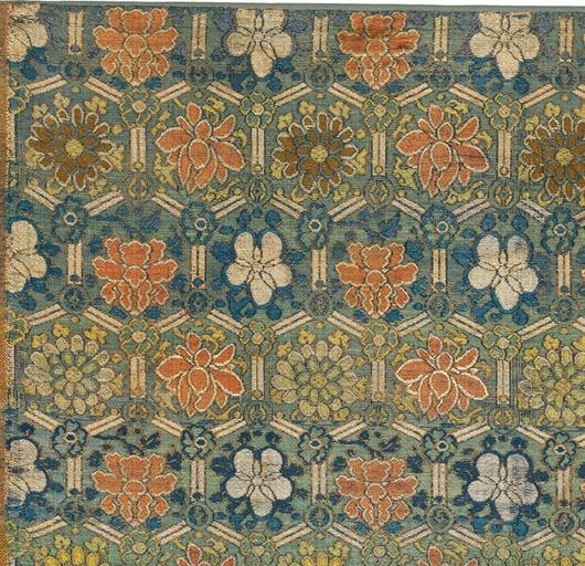 | Keywords: Ming flower brocade (cropped).jpg en RH3571 Textile Fragment 27 x 29 5 in 69 x 75 cm 14th/17th Century Published in Threads of Imagination Spink Catalog 1999 pl 16 A panel of silk brocade woven with a hexagonal lattice enclosing pink white and yellow flowers including peonies and lotus woven with a gilt outline against a sea-green ground Ming Dynasty 6 000 Ming brocades were sought after the world over their eye-pleasing patterns making their way to the viceroyalties of Mexico and Peru India Turkey western Europe and Japan where they influenced local weaving motifs and techniques RH3571 RH3570 http //www hali com/news/hollander-collection-chinese-central-asian-silk-textiles-online-exhibition-sale/ Unknown Chinese weaver Photo by gallery 14th to 17th century PD-old-100 Textiles of the Ming Dynasty Flowers in art Files uploaded by PDTillman 16th-century textiles Brocade Spink Auctions Hexagonal lattices Ming flower brocade jpg Taken with Hasselblad H5D-200c MS |