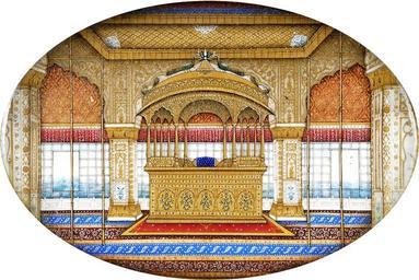 | Keywords: Miniatur Indien Agra Palastsaal.jpg Palastsaal in Agra Miniatur Indien 19 Jahrhundert Gouache auf Elfenbein Ca 13 x 8 5 cm Depiction of the Peacock Throne in the Diwan-i-Khas of the Red Fort either in Delhi or Agra Miniature India 19th century Gouache on ivory Around 13 x 8 5 cm http //www duesseldorfer-auktionshaus de/de/katalog/view_cat/01_2011/500_A-Gem C3 A4lde 2011/1 century 19 anonymous 100px PD-Art-100 Images from Düsseldorfer Auktionshaus Red Fort in art Paintings on ivory from India Peacock Throne |