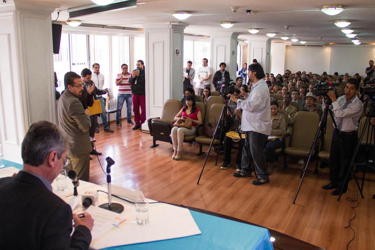 Keywords: indoor Quito, 18 de octubre de 2016. Hoy, Raúl Vallejo, Ministro de Cultura y Patrimonio del Ecuador (MyCP), en rueda de prensa, anunció los resultados de las postulaciones a los Fondos Concursables 2016-2017 en las categorías de los proyectos artísticos, culturales y festivales. En total fueron 170 las propuestas seleccionadas. Cada una recibirá entre seis mil y 25 mil dólares, no reembolsables, para su ejecución y sus beneficiarios serán notificados durante los tres días siguientes. En la categoría: Proyectos artísticos y culturales de libre creación, fueron escogidas 116 propuestas, con una inversión de un millón de dólares; y en el caso de festivales artísticos, fueron 54, con un monto de 720 mil dólares. 200 mil dólares más serán destinados a festivales emblemáticos que se conocerán en próximas fechas. El titular de la Cartera de Cultura y Patrimonio destacó que los Fondos Concursables constituyen un hito para el apoyo a la creatividad y circulación de las artes en el Ecuador: “Desde el año 2008 hasta hoy, el Estado, a través del MCYP, ha destinado 13’645.411,08 de dólares de financiamiento público para esta clase de proyectos”. Además señaló que el montó utilizado para este año, “servirá de base en el presupuesto estatal de lo que será el Instituto Nacional de Fomento a las Artes y la Creatividad, este último creado en el proyecto de Ley de Cultura, próxima a tratarse en la Asamblea” , acotó Vallejo. La convocatoria anual a los Fondos Concursables se ha consolidado como un ejercicio democrático amplio y de incentivo para los creadores y los artistas en todo el país. A partir de 2015 se implementó la asignación de recursos por zonas determinadas por la SENPLADES, con la finalidad de garantizar el acceso y evitar la concentración de recursos. A escala nacional fueron aceptadas 1568 postulaciones correspondientes a las dos categorías. Para solventar cualquier inquietud remitirse a los siguientes correos: fondoslibrecreacion@culturaypatrimonio.com festivales@culturaypatrimonio.com Quito, 18 de octubre de 2016. Hoy, Raúl Vallejo, Ministro de Cultura y Patrimonio del Ecuador (MyCP), en rueda de prensa, anunció los resultados de las postulaciones a los Fondos Concursables 2016-2017 en las categorías de los proyectos artísticos, culturales y festivales. En total fueron 170 las propuestas seleccionadas. Cada una recibirá entre seis mil y 25 mil dólares, no reembolsables, para su ejecución y sus beneficiarios serán notificados durante los tres días siguientes. En la categoría: Proyectos artísticos y culturales de libre creación, fueron escogidas 116 propuestas, con una inversión de un millón de dólares; y en el caso de festivales artísticos, fueron 54, con un monto de 720 mil dólares. 200 mil dólares más serán destinados a festivales emblemáticos que se conocerán en próximas fechas. El titular de la Cartera de Cultura y Patrimonio destacó que los Fondos Concursables constituyen un hito para el apoyo a la creatividad y circulación de las artes en el Ecuador: “Desde el año 2008 hasta hoy, el Estado, a través del MCYP, ha destinado 13’645.411,08 de dólares de financiamiento público para esta clase de proyectos”. Además señaló que el montó utilizado para este año, “servirá de base en el presupuesto estatal de lo que será el Instituto Nacional de Fomento a las Artes y la Creatividad, este último creado en el proyecto de Ley de Cultura, próxima a tratarse en la Asamblea” , acotó Vallejo. La convocatoria anual a los Fondos Concursables se ha consolidado como un ejercicio democrático amplio y de incentivo para los creadores y los artistas en todo el país. A partir de 2015 se implementó la asignación de recursos por zonas determinadas por la SENPLADES, con la finalidad de garantizar el acceso y evitar la concentración de recursos. A escala nacional fueron aceptadas 1568 postulaciones correspondientes a las dos categorías. Para solventar cualquier inquietud remitirse a los siguientes correos: fondoslibrecreacion@culturaypatrimonio.com festivales@culturaypatrimonio.com