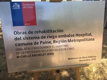 | Keywords: outdoor text Paine, jueves 24 de noviembre de 2016.- El Ministro de Obras Públicas, Alberto Undurraga, y el Ministro de Agricultura, Carlos Furche, encabezaron hoy la ceremonia de inauguración del nuevo Embalse de Riego Hospital en la comuna de Paine, obra que forma parte del Plan Nacional de Construcción y Rehabilitación Pequeños Embalses del Ministerio de Obras Públicas. El Ministro Alberto Undurraga destacó que “estas obras son muy importantes por su funcionalidad para dar un mejor uso al agua y también para mejorar la calidad de vida y oportunidades de desarrollo de los habitantes de la comuna de Paine”. “Estamos haciendo otros 24 pequeños embalses como este en distintos lugares de nuestro país y dejaremos otros 8 grandes embalses en licitación o construcción, con ello durante el Gobierno de la Presidenta Bachelet, estaremos construyendo más infraestructura para el agua que nunca en la historia de Chile”, explicó el Secretario de Estado. Por su parte, el Ministro de Agricultura, Carlos Furche, manifestó que "esto es muy importante para quienes son beneficiarios directos, más de 1.000 pequeños productores que van a aumentar su capacidad productiva, de frutas y hortalizas que abastecen además a la región Metropolitana". Además, el titular del Agro agregó que esto tiene una importancia que va un poco más allá de haber cumplido a tiempo un compromiso que tomaron hace un año con los dirigentes de esta comunidad, porque permite mostrar que es posible avanzar simultáneamente en la entrega de obras como estas y en la modificación del marco regulatorio. "Ambas cosas se pueden hacer en simultáneo y es lo que estamos haciendo. De manera que esto es una buena noticia para los productores y es un ejemplo de lo que estamos haciendo en todo Chile. Tranques como estos estamos entregando casi todos los meses a lo largo del país", explicó. En la oportunidad, la Secretaria Ejecutiva de la Comisión Nacional de Riego (CNR), María Loreto Mery, destacó que “en materia de planificación del riego estamos trabajando muy de la mano con el Ministro de Obras Públicas, ya que estamos viendo las distintas necesidades multipropósito del recurso hídrico. Algunos de los embalses que estamos rehabilitando no son sólo para riego, sino también para agua potable rural o contribuir ante hechos de emergencia como un incendio forestal”. El nuevo Embalse Hospital permitirá entregar una capacidad de almacenamiento de 200.000 m3, que permitirán a 1.200 pequeños agricultores el riego de más de 2.000 hectáreas de terrenos, principalmente cultivos de frutas y verduras. Las obras, que fueron ejecutadas por el Ministerio de Obras Públicas, a través de su Dirección de Obras Hidráulicas, representaron una inversión de 484 millones de pesos, destacando el retiro de 70.000 m3 de sedimento, el revestimiento en hormigón de 300 metros del canal alimentador que trae las aguas del Río Angostura, el recambio de las 6 compuertas, la construcción de un desarenador y un vertedero para evacuación de crecidas. El Plan de Construcción y Rehabilitación Pequeños Embalses contempla la intervención de 25 embalses, de ellos 8 rehabilitaciones se encuentran terminadas, se trata de los embalses Chada y Hospital en Paine; Los Molles de Melipilla; Santa Rosa en Limache; El Principal de Pirque; Rautén Bajo en Quillota; Santa Julieta y Concepción en Ovalle. Además, de otros 2 en ejecución: Huechún en Melipilla y San Antonio en Ovalle. En paralelo, se encuentra en construcción el Embalse Empedrado en la Región del Maule y en estudio 24 sitios, entre las regiones de Coquimbo y La Araucanía, para construir nuevos pequeños embalses. Durante la ceremonia de inauguración del nuevo Embalse Hospital también participaron el Director General de Aguas, Carlos Estévez; el Director Nacional de Obras Hidráulicas, Reinaldo Fuentealba; la Secretaria Ejecutiva de la CNR, Loreto Mery; el Gobernador de la Provincia del Maipo, Felipe Jeldres y el Presidente de la Comunidad de Aguas del Canal Hospital, Víctor Catalán. Paine, jueves 24 de noviembre de 2016.- El Ministro de Obras Públicas, Alberto Undurraga, y el Ministro de Agricultura, Carlos Furche, encabezaron hoy la ceremonia de inauguración del nuevo Embalse de Riego Hospital en la comuna de Paine, obra que forma parte del Plan Nacional de Construcción y Rehabilitación Pequeños Embalses del Ministerio de Obras Públicas. El Ministro Alberto Undurraga destacó que “estas obras son muy importantes por su funcionalidad para dar un mejor uso al agua y también para mejorar la calidad de vida y oportunidades de desarrollo de los habitantes de la comuna de Paine”. “Estamos haciendo otros 24 pequeños embalses como este en distintos lugares de nuestro país y dejaremos otros 8 grandes embalses en licitación o construcción, con ello durante el Gobierno de la Presidenta Bachelet, estaremos construyendo más infraestructura para el agua que nunca en la historia de Chile”, explicó el Secretario de Estado. Por su parte, el Ministro de Agricultura, Carlos Furche, manifestó que "esto es muy importante para quienes son beneficiarios directos, más de 1.000 pequeños productores que van a aumentar su capacidad productiva, de frutas y hortalizas que abastecen además a la región Metropolitana". Además, el titular del Agro agregó que esto tiene una importancia que va un poco más allá de haber cumplido a tiempo un compromiso que tomaron hace un año con los dirigentes de esta comunidad, porque permite mostrar que es posible avanzar simultáneamente en la entrega de obras como estas y en la modificación del marco regulatorio. "Ambas cosas se pueden hacer en simultáneo y es lo que estamos haciendo. De manera que esto es una buena noticia para los productores y es un ejemplo de lo que estamos haciendo en todo Chile. Tranques como estos estamos entregando casi todos los meses a lo largo del país", explicó. En la oportunidad, la 