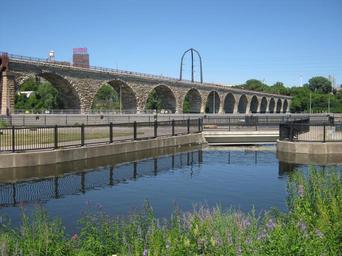 Keywords: minneapolis bridge minnesota river mississippi downtown city usa urban architecture landmark arch sky building cityscape structure exterior america midwest scene outdoors water