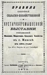 | Keywords: Minsk Society of Agriculture jubilee - 1900 AD.jpg en The cover of the book Rules of the jubilee agricultural and handicraft industrial exhibition organized by the Minsk society of agriculture Minsk city Russian Empire 1900 AD ru Обложка книги П авила юбилейной сельско-хозяйственной и куста но-п омышленной выставки уст аиваемой инским обществом сельского хозяйства г инск Российская импе ия 1900 г be Вокладка кнігі П авілы юбілейнай сельска-гаспада чай і саматужна-п амысловай выстаўкі ладжанай інскім тава ыствам сельскай гаспада кі г інск Расійская імпе ыя 1900 г a reproduction from the book Шыбека З В инскъ сто гадоў таму / З В Шыбека інск Бела усь 2007 304 с Minsk Society of Agriculture Rissian empire 1900 Minsk Society of Agriculture PD-old |