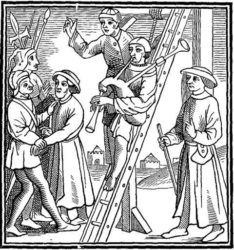 | Keywords: Minstrel condemned to the Gallows.png Hanging to Music A Minstrel condemned to the Gallows obtained permission that one of his companions should accompany him to his execution and play his favourite instrument on the ladder of the Gallows -- Fac-simile of a Woodcut in Pierre Michault's Doctrinal du Temps Présent small folio goth Bruges about 1490 Paul Lacroix http //www gutenberg org/etext/10940 Manners Custom and Dress During the Middle Ages and During the Renaissance Period 1876 http //www gutenberg org/files/10940/10940-h/images/fig350 png fig 350 End of 15th c author PD-old Hanging in art Bagpipers in art 15th-century woodcuts Black and white drawings of men 1490 |