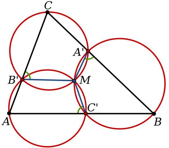 Keywords: Miquel Circles.svg Miquel's theorem - if three points A' B' C' are on the sides of a triangle ABC then the circles passing through a vertex and the two points on the adjacent sides will be concurrent at a point M Own Inductiveload 2009-02-24 Miquel's theorem |