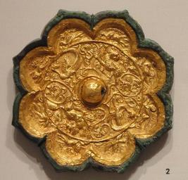 Keywords: Mirror with Foliate Rim and Inset Gold Plaque, 8th century, Tang dynasty, China, cast bronze with gold inset - Sackler Museum - DSC02599.JPG Exhibit in the Sackler Museum Harvard University Cambridge Massachusetts USA The museum permitted photography of this artwork without restriction This artwork is in the public domain because the artist died more than 70 years ago Daderot 2012-11-17 12 43 08 Daderot cc0 cc0 Chinese metalwork in the Sackler Museum Bronze mirrors of the Tang Dynasty
