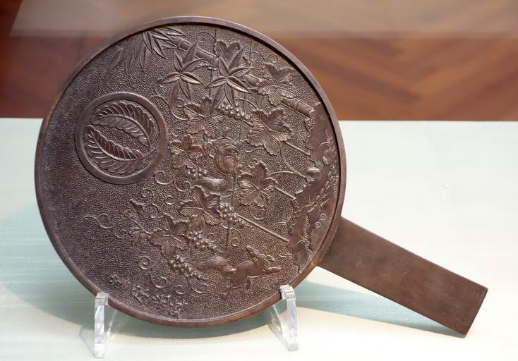 | Keywords: Mirror with handle, Edo period, 18th century, oak-leaf crest, grape trellis, and squirrel design - Tokyo National Museum - DSC06070.JPG en Exhibit in the Tokyo National Museum Tokyo Japan This artwork is old enough so that it is in the public domain 2013-09-03 00 35 50 own Daderot cc-zero Edo bronze mirrors in the Tokyo National Museum Uploaded with UploadWizard | ||||