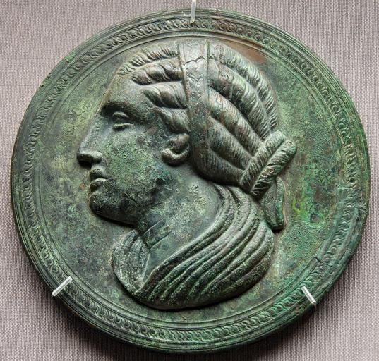 | Keywords: Mirror woman BM 3211.jpg Head of a woman with Hellenistic hairstyle and lion-earrings mirror cover Said from Polyrrhenia Crete Tête de femme portant une coiffure hellénistique et des boucles d'oreilles à tête de lion valve de miroir Provenance Polyrrhenia Crète ca 300 275 BC bronze cm 16 1 Institution British Museum Main floor Room 22 Alexander the Great the Hellenistic world 437291 object history credit line ProvenanceEvent purchase T B Sandwith 1898 accession number GR 1898 10-19 1 own photo date 2006 Marie-Lan Nguyen artwork license PD-old-100 photo license other versions Ancient Greek mirrors United Kingdom Ancient Greek bronzes in the British Museum Round reliefs of women Profile reliefs of women Faces in profile Room 22 British Museum 300s BC bronzes 290s BC bronzes 280s BC bronzes Polyrrhenia Female hair fashion in art 4th-century BC art in the United Kingdom 3rd-century BC art in the United Kingdom 3rd-century BC works in the United Kingdom |