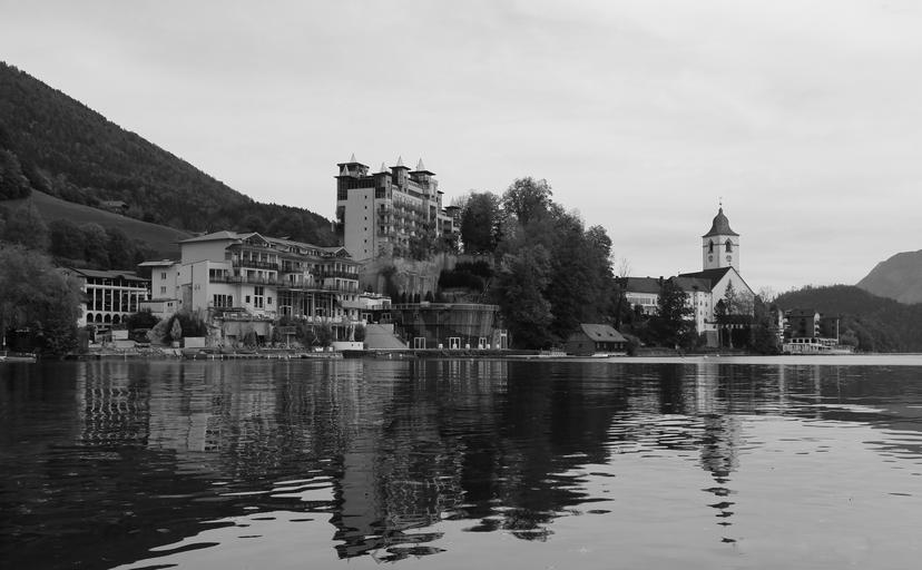 Keywords: mirroring water lake wave clouds reflection homes church village black and white landscape