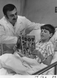 | Keywords: comic book comicbook blackandwhite monochrome indoor black and white Headed for home - Commander Frank E. Ehrlich, Medical Corps, U.S. Navy, chief of pediatric surgery at Naval Hospital, Portsmouth, Virginia, finds Brian LeBlanc reading a comic book a few hours after surgery. Brian was hospitalized less than 24 hours for his operation.[Pediatrics.][Hospitals, wards.] 4/1974. Headed for home - Commander Frank E. Ehrlich, Medical Corps, U.S. Navy, chief of pediatric surgery at Naval Hospital, Portsmouth, Virginia, finds Brian LeBlanc reading a comic book a few hours after surgery. Brian was hospitalized less than 24 hours for his operation.[Pediatrics.][Hospitals, wards.] 4/1974. |