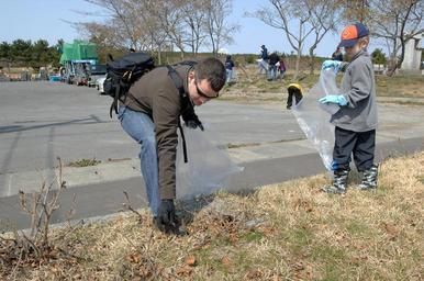 | Keywords: Misawa sailors help clean up local fish port 120421-N-ZI955-009.jpg en Chief Mass Communication Specialist David Crawford assigned to American Forces Network Misawa and originally from Marksville La along with his son Baylee age six pick up trash during an Earth Day cleanup at the local Misawa port area Sailors and airmen from Misawa Air Base spent the morning cleaning up the Misawa Fish Port and helping remove several tons of trash from the area 2012-04-21 Senior Chief Petty Officer Daniel Sanford https //www dvidshub net/image/563390 120421-N-ZI955-009 2012-04-22 07 06 MISAWA AOMORI JP PD-USGov-Military-Navy Misawa Air Base Images from DoD uploaded by Fæ |