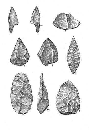 | Keywords: Miscellaneous stone tools.jpg Сл 26 К емена о уђа из азних векова палеолитске пе иоде а из азних земаља 1 и 1а доња и го ња ст ана ст елице са запе ком за углављивање; нађено у долини Виб ате Из исте су земље м Омб ија ст угало насликано под 2 и ошиљак под 3 Из Енглеске је мустије ски а тефакт под 4 и ста ији под 6 и 6а Овај последњи нађен је још 1799 године у Хоксну Из исте је земље и ошт ељ за џилит фо ме т ећег века али из доба познијега 7 п едставља к емено о уђе шелске фо ме из квате нога наноса у долини Делава а недалеко од Њу-Џе сеја Севе на Аме ика Project Rastko Kameno doba |