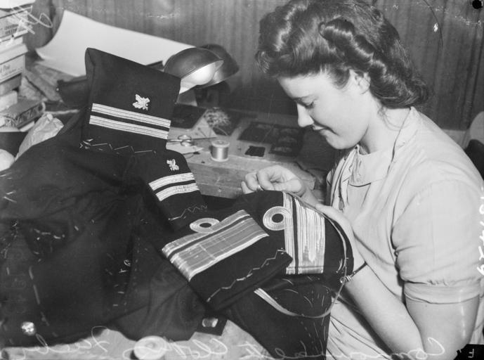Keywords: australian war memorial australianwarmemorial sewing blackandwhite monochrome indoor black and white ID number: 139429 Photographer: Herald Newspaper Place made: Melbourne, Victoria Date made: 10 August 1943 Miss Winifred Yates, an employee of the Commonwealth Clothing Factory, stitching gold bullion braid on naval uniforms. Rights information: No known copyright restrictions. This photograph is from the Australian War Memorial's collection www.awm.gov.au Persistent URL: cas.awm.gov.au/item/139429 ID number: 139429 Photographer: Herald Newspaper Place made: Melbourne, Victoria Date made: 10 August 1943 Miss Winifred Yates, an employee of the Commonwealth Clothing Factory, stitching gold bullion braid on naval uniforms. Rights information: No known copyright restrictions. This photograph is from the Australian War Memorial's collection www.awm.gov.au Persistent URL: cas.awm.gov.au/item/139429 |