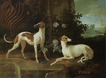 Keywords: Misse and Turlu, Two Greyhounds Belonging to Louis XV.jpg Uploaded with en wp UW marker 2013 01 24 Jean-Batiste Oudry Original publication Unknown<br/> Immediate source http //www texasitaliangreyhounds com/tag/france/ 1725 Jean-Baptiste Oudry<br/> Life time 1686-1755 Musée national du Château de Fontainebleau Accurate photographs of two-dimensional visual artworks lack expressive content and are automatically in the public domain once the painting's copyright has expired which it has in the US if it was published before 1923 All other copyright notices can safely be ignored Whippet 18th-century greyhounds in art Paintings of animals by Jean-Baptiste Oudry Musée national du Château de Fontainebleau PD-old-100-1923