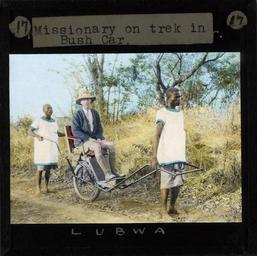 | Keywords: Missionary on Trek in Bush Car, Lubwa, Zambia, ca.1905-ca.1940 (imp-cswc-GB-237-CSWC47-LS6-017).jpg en <br> Missionary on Trek in Bush Car Lubwa Zambia ca 1905-ca 1940 Photograph of a missionary in a bush car The bush car is a portable single chair which is wheeled on a frame The missionary is sitting in the middle of the frame above a single wheel There is one man at the front pulling the car and one man at the back pushing The missionary is being transported along a dirt road ; This belongs to a series of Church of Scotland Foreign Missions Committee lantern slides relating to Lubwa mission Lubwa mission at Chinsali in north-eastern Zambia began as an outpost of the Free Church of Scotland mission in Malawi The first missionary expeditions to the Chinsali area were carried out by student teachers from the Overtoun Institute at Khondowe The Bemba are the largest ethnic group in northern Zambia and the first Free Church of Scotland establishment among the Bemba was a school at Lubwa opened in 1905 by the Malawian teacher David Kaunda and his wife Photographer Unknown Filename imp-cswc-GB-237-CSWC47-LS6-017 tif Coverage date 1905/1940 Part of collection International Mission Photography Archive ca 1860-ca 1960 Type images Part of subcollection Photographs from the Centre for the Study of World Christianity University of Edinburgh U K ca 1900-ca 1940s Repository name Centre for the Study of World Christianity Archival file impaunpub_Volume7/1577 url Repository address The University of Edinburgh School of Divinity New College Mound Place Edinburgh EH1 2LX United Kingdom Geographic subject country Zambia Format aacr2 1 lantern slide 8 x 8 cm Geographic subject continent Africa Rights Contact the repository for details Part of series Lubwa LS6 Repository email divinity-CSWC ed ac uk Subject lcsh Keyword Transportation; Missionaries Date created 1905/1940 Publisher of the digital version University of Southern California Libraries Subject aat genre close-up views Format aat lantern slides Legacy record ID impa-m68675 Access conditions http //www ed ac uk/schools-departments/divinity/research/centres/world-christianity/collections-resources File GB 237 CSWC47/LS6/17 1905/1940 author http //digitallibrary usc edu/cdm/ref/collection/p15799coll123/id/64697 PD-old-70-1923 Magic lantern images Images from USC Digital Library uploaded by Fæ International Mission Photography Archive ca 1860-ca 1960 |