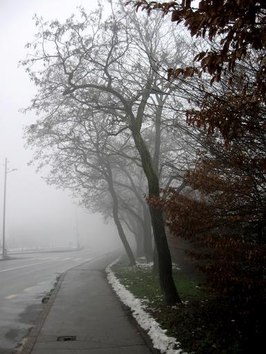 Keywords: misty road tree winter fog cold gloomy