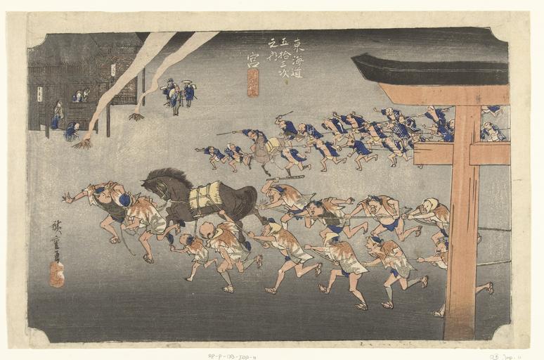 | Keywords: Miya, Shintoïstische ceremonie bij het Atsuta heiligdom-Rijksmuseum RP-P-OB-JAP-11.jpeg accession number RP-P-OB-JAP-11 Utagawa; Hiroshige I Utagawa died 1858; Takenouchi Magohachi Hoeido Hiroshige I credit line GWToolset Rijksmuseum nl Twee groepen mannen zich vasthoudend aan touwen bevestigd aan aangedreven paarden; op de voorgrond een torii; op de achtergrond toeschouwers bij houten huizen met rokende vuren; bij avond Label Line mentioned on object Hiroshige I Utagawa 1797 - 1858 1828 - 1835 kleurenhoutsnede; lijnblok in zwart met kleurblokken Collection prenten; Japan collectie beeld Height mm 225 beeld Width mm 346 exhibition history paper object history object type PD-US PD-old Data and photography rights All data and all images made available through the API are either in the public domain or are subject to a CC0 license https //www rijksmuseum nl/en/api/terms-and-conditions-of-use cc-zero place of creation Japan; Tokyo http //www rijksmuseum nl/collectie/RP-P-OB-JAP-11 http //hdl handle net/10934/RM0001 COLLECT 45989 handle Miya Shintoïstische ceremonie bij het Atsuta heiligdom Uploaded with GWToolset Rijksmuseum RP-P-OB-JAP-11 http //www rijksmuseum nl/media/assets/RP-P-OB-JAP-11 Images uploaded by Fæ Japanese 19th-century prints in the Rijksmuseum Amsterdam Images from the Rijksmuseum |