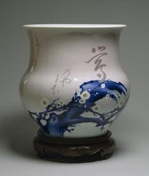 | Keywords: Miyagawa Kozan - Vase with Blossoming Plum and Short Poem - Walters 491912 - Profile.jpg Around the year 950 the emperor received an anonymous poem that made him change his mind about removing an ancient plum tree that had recently died Since my lord commands what can I do but obey; but the nightingales when they ask about their nests-- whatever can I tell them The character for nightingale is perched upon the branch; amazingly it and the other characters consists of clay inserted into the cut-out wall of the vessel ca 1904 Meiji porcelain with underglaze blue pink and yellow Overall cm 35 56 31 24 ; Vase cm 31 75 31 24 ; Wooden Base cm 6 35 22 86 accession number 49 1912 16302 Louisiana Purchase Exposition St Louis Henry Walters Baltimore December 1904 by purchase Walters Art Museum Henry Walters Acquired by Henry Walters 1904 Poem Transcription Choku nareba itomo kashikoshi uguisu no yado wa to towaba ikaga kotaemu / Ki no Tsurayuki onna; Poem Translation Since my Lord commands what can one do but obey But the nightingales when they ask about their nests- whatever can I tell them Poem written by Ki no Naishi the daughter of the famous Heian-period poet Ki no Tsurayuki ca 872-945 ; Seal Xuande Hsuan-te; Transcription Makuzu gama Kozan sei; Translation Made by Kozan Makuzu kiln; Sticker Japanese export sticker 1904 Master Potters of Japan The Walters Art Gallery Baltimore 1984 Bridging East and West Japanese Ceramics from the Kozan Studio The Walters Art Gallery Baltimore 1994-1995 place of origin Yokohama Japan PD-old-auto 1916 Porcelain vases Blue and white porcelain Miyagawa Koza Meiji ceramics in the Walters Art Museum Media contributed by the Walters Art Museum needs category review |
