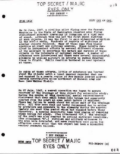 | Keywords: MJ 003.jpg en The Majestic 12 document Number 1 internet top secret The image reads; On 24 June 1947 a civilian pilot flying over the Cascade Mountains in the State of Washington observed nine flying disc-shaped aircraft traveling in formation at a high rate of speed Although this was not the first known sighting of such objects it was the first to gain widespread attention in the public media Hundreds of reports of similar sightings followed Many of those came from highly credible military and civilian sources These reports resulted in independent efforts by several different elements of the military to ascertain the nature and purpose of these objects in the interest of national defense A number of witnesses were interviewed and there were several unsuccessful attempts to utilise aircraft in efforts to pursue reported discs in flight Public reaction bordered on near hysteria at times In spite of these efforts little of substance was learned about the objects until a local rancher reported that one had crashed in a remote region of New Mexico located approximately seventy-five miles northwest of Roswell Army Air Base now Walker Field On 07 July 1947 a secret operation was begun to assure recovery of the wreckage of this object for scientific study During the course of this operation aerial reconnaissance discovered that four small human-like beings had apparently ejected from the craft at some point before it exploded These had fallen to earth about two miles east of the wreckage site All four were dead and badly decomposed due to action by predators and exposure to the elements during the approximately one week time period which had elapsed before their discovery A special scientific team took charge of removing these bodies for study See Attachment C The wreckage of the craft was also removed to several different locations See Attachment B Civilian and military witnesses in the area were debriefed and news reporters were given the effective cover story that the object had been a misguided weather balloon PD-USGov Roswell UFO incident |