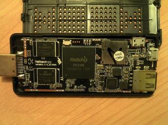 | Keywords: MK809III V1.0 130606 inside front.jpg en Originally produced as an Android Mini-PC TV-Stick there is a range of Operating Systems to run on RK3188 ARM SoC devices such as this one Despite the Android logo on the outside it also runs other Linux distributions The specific model name found on the board inside is MK809III V1 0 This device was built in the 25th week of 2013 and the PCB revision dates 2013-06-06 Its characteristics are Rockchip RK3188 ARMv7 SoC GEIL 2GB DDR3 RAM memory SK hynix 8GB NAND memory Active ACT8846 Voltage Regulator Broadcom AP6210 WIFI/BT Combo ITE IT66121 HDMI chip Blue LED power on customizable 1 recovery button paper clip hole on the side 1 µSDHC card reader 1 USB2 0 OTG micro size connector for peripheral or nand flash see below 1 USB2 0 micro size connector for 5V 2A power connect in normal usage 1 USB2 0 HOST full size connector for peripheral to flash the device unplug every port of the device use a paper clip to push the recovery button and hold connect OTG port ONLY to a PC wait a couple of seconds release recovery button flash using your favorite software The device is very similar to Rikomagic MK802 IV or Radxa Rock devices up to the extent that firmwares are interchangable They are all built around the same RK3188 ARMv7 SoC The Kernel can be customized by the end user as leaked Rockchip Kernel sources versioned 3 0 36 may be found on Github Some work is in progress to integrate support into mainline kernel tree For more info see http //linux-rockchip info/mw/index php title RK3188 2014-04-15 04 47 30 own Cmuelle8 cc-zero Uploaded with UploadWizard MK809III |