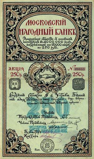 | Keywords: MNB-share2.jpg ru Акция осковского а одного Банка на 250 уб выпуска 1917 года на имя Бежецкого Союза К едитно и Судно-Сбе егательных Това иществ Тве ской губе нии http //www bull-bear ru/catalog/unusual/map/12110 jpg 1917 осковский а одный Банк 1917 Original upload log ru wikipedia ftcg page ru wikipedia MNB-share2 jpg wikitable - 10 45 10 March 2010 2 074 × 3 505 1 781 968 bytes SenchenkoVladimir w ru <nowiki> Изоб ажение Описание Акция осковского а одного Банка на 250 уб выпуска 1917 года Источник http //www bull-bear ru/catalog/unusual/map/12110 jpg В ем�</nowiki> Stock certificates from Russia |